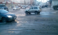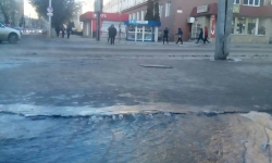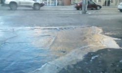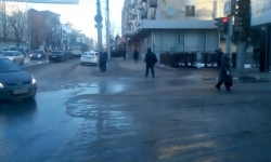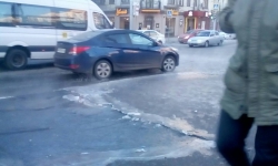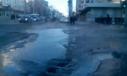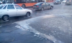 Следует отметить, что из-за низкой температуры воздуха на месте прорыва очень быстро образовывается снежная каша и наледь. Что будет на перекрестке через несколько часов в случае, если течь воды не будет остановлена, можно только предполагать.