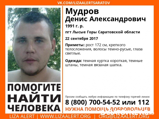 В Саратовской области волонтеры и полиция продолжают поиски пропавшего 22 сентября прошлого года 26-летнего Дениса Мудрова из поселка Лысые Горы. Об этом сегодня сообщается в группе поискового отряда "Лиза Алерт".