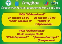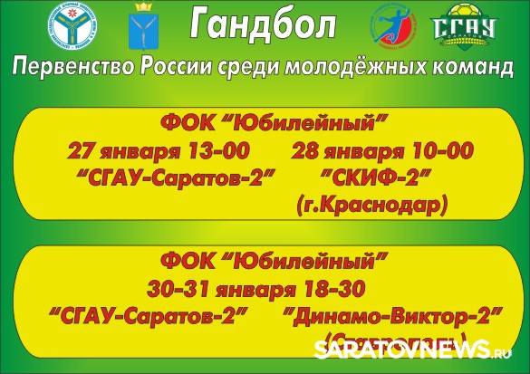 27 и 28 января "СГАУ-Саратов-2" принимает лидера чемпионата, краснодарский "СКИФ-2". 27 января игра начнется в 13-00, а 28 января в 10-00. 30 и 31 января "молодежка желто-зеленых" принимает одного из главных конкурентов за попадание в первую восьмерку, ставропольский "Динамо-Виктор-2". Игры начнутся в 18-30.