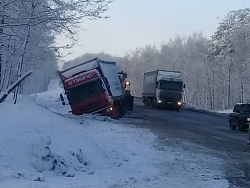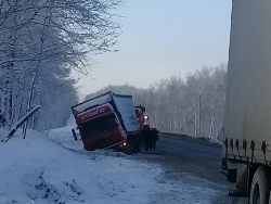 В настоящее время посредством тяжелой техники фуру пытаются вернуть на трассу. О пострадавших в ДТП пока не сообщается.