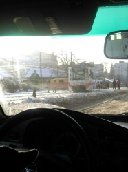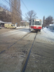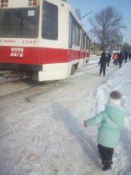 Сообщается, что все произошло неподалеку от дома №77 по улице Огородной. Трамвай, курсирующий по маршруту №9 сошел с рельсов и врезался в знак пешеходного перехода – в результате он оказался на крыже электротранспорта.