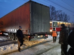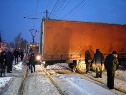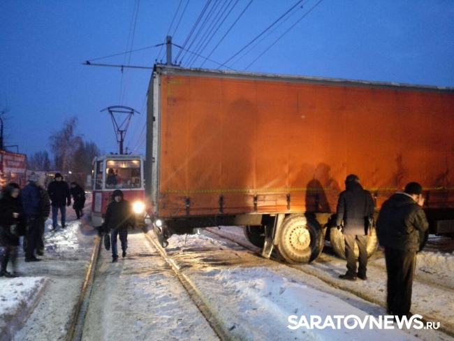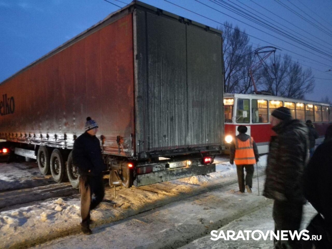 Как сообщили Saratovnews очевидцы случившегося, в 100 метрах от остановки "Стадион "Авангард" рядом с заправкой грузовик "КамАЗ" выезжал с автобазы и застрял на путях.