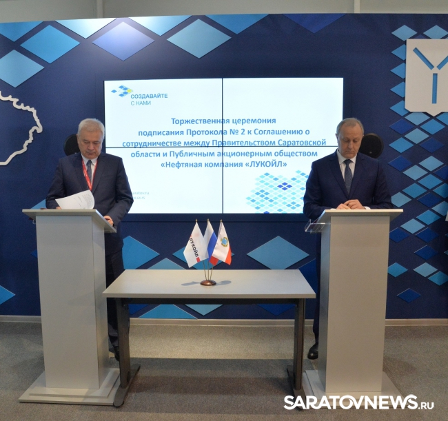 Также саратовская делегация закрепила партнерство с крупнейшими российскими компаниями. В протоколе к соглашению региона с ПАО "Нефтяная компания "ЛУКОЙЛ" стороны договорились о реконструкции и строительстве новых АЗС на территории области с общим объемом инвестиций 784,5 миллиона рублей. Также компания берет на себя дополнительные обязательства по участию в социально-экономическом развитии региона и благотворительных проектах. Так, завод "Саратоворгсинтез" (дочернее предприятие ПАО "ЛУКОЙЛ") примет участие в ремонте и благоустройстве детских и спортивных дворовых площадок, расположенных в Заводском районе Саратова.