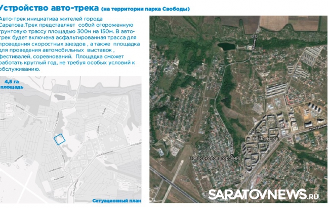 Согласно документу, авто-трек предполагается сделать в парке Свободы в поселке Юбилейный. На площади 4,5 гектара предлагается построить грунтовую трассу для скоростных заездов , а также площадку для проведения автомобильных выставок, фестивалей, соревнований. Кроме того, в брендбуке значится благоустройство Рахова, набережной Космонавтов, проспекта Кирова и других территорий.