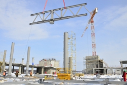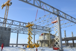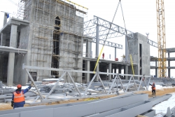 Сообщается, что в настоящее время ведется монтаж металлических перекрытий кровли здания. Строители занимаются установкой девятиметровых стальных опор и монтировкой ферм перекрытия аэровокзала. Данные работы выполняются на самых высоких отметках здания – на уровне 20 метров от земли.