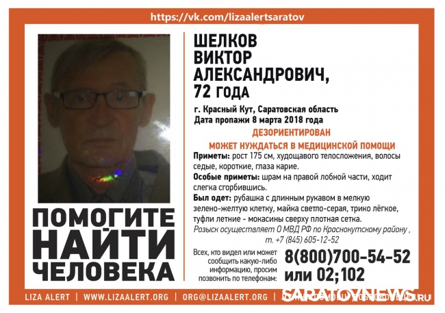 В Красном Куте Саратовской области пропал 72-летний Виктор Александрович Шелков. Как сообщают активисты в группе "Лиза Алерт Саратов" в соцсети "Вконтакте", пропавший мужчина ушел из дома 8 марта 2018 года и не вернулся. Он дезориентирован и