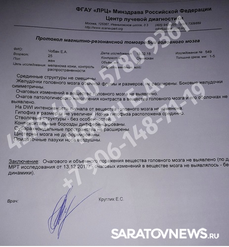 "Все началось с удаления обычной родинки. Врач прижег мне ее, что в случае меланомы делать нельзя. Через два дня врач позвонил мне и рекомендовал приехать, анализ цитологии был плохой. В рамках клиники я прошла все соответствующие МРТ, Т и другие исследования. Меня прооперировали, сказали, что опухоль не обнаружена, и отпустили с добрым словом домой, без каких-либо рекомендаций. Хотя меня должны были определить в онкоцентр, упустили драгоценное время", - пишет жительница Ершова.