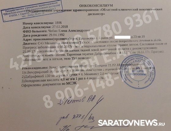 Жительнице Ершова Саратовской области требуется помощь на лечение меланомы - рака кожи.