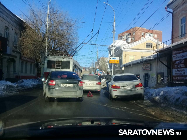 Около получаса назад в центре Саратова столкнулись три иномарки. Об этом Saratovnews рассказали очевидцы происшествия.