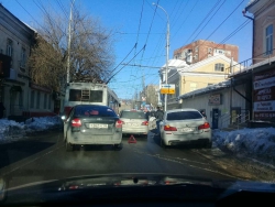 В настоящее время затруднено движение по улице Чернышевского в сторону Московской. Автовладельцам приходится объезжать аварию по полосе встречного движения.