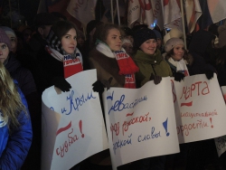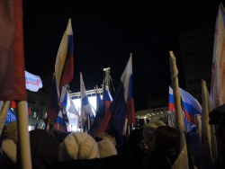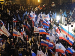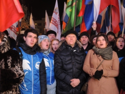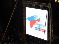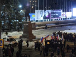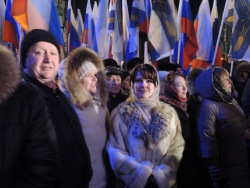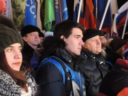 Собравшиеся скандировали "Севастополь! Крым! Россия". Многие пришли с плакатами с надписями "Крым наш", "Гордимся Россией", "Россия и Крым - это судьба".