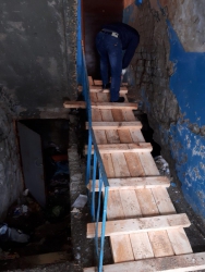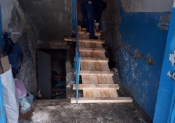 Вместо обрушившихся ступенек уложили деревянные поддоны, по которым жители попадают в свои квартиры.