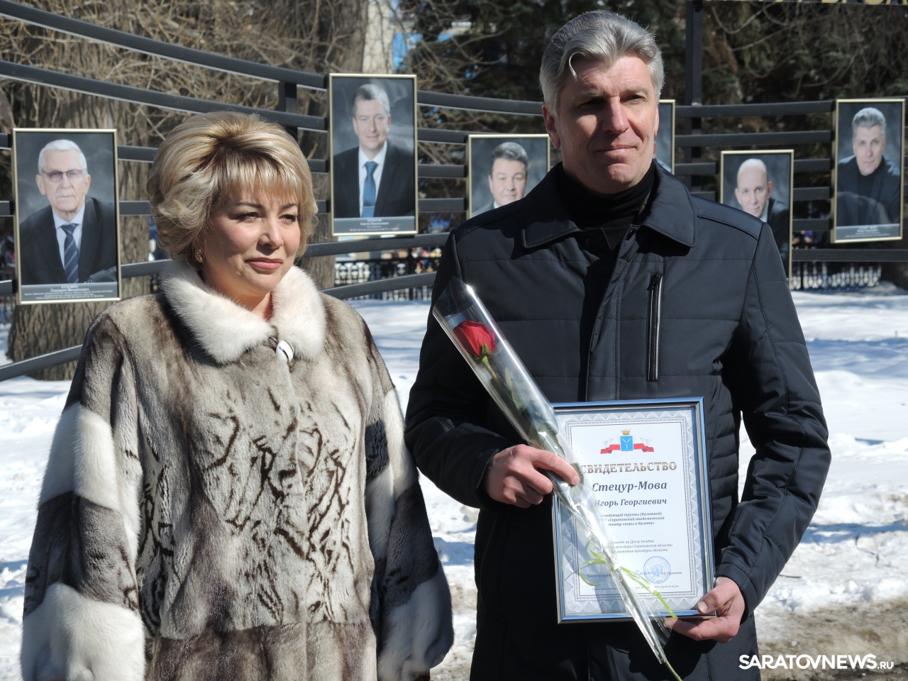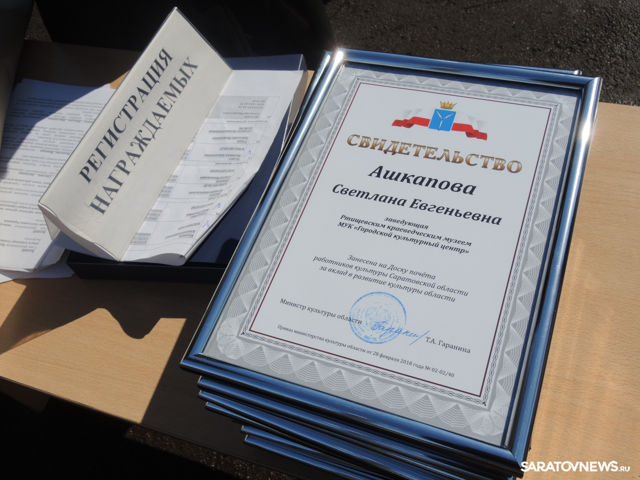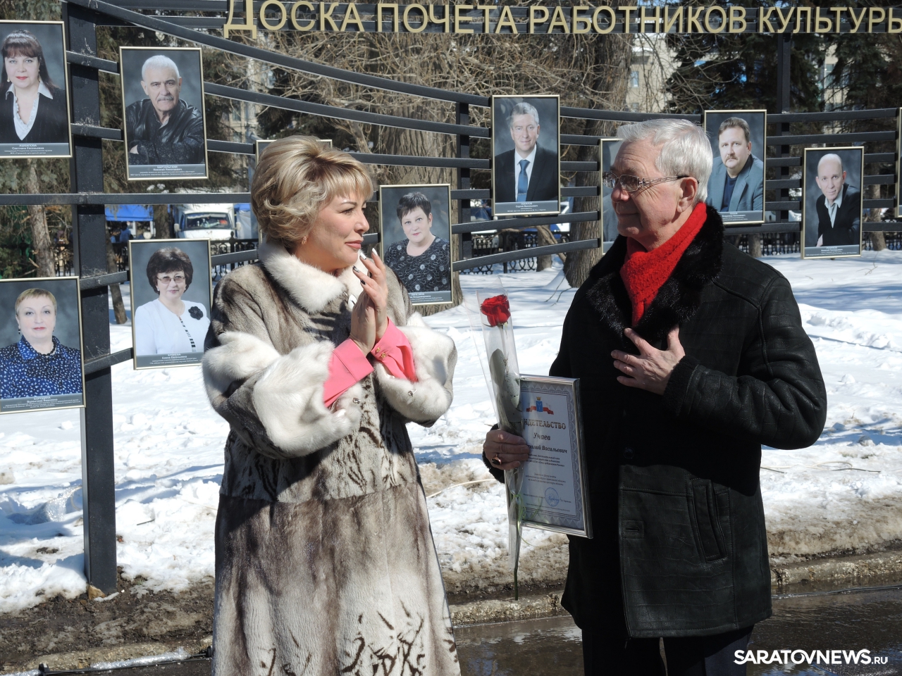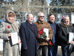 Затем работникам культуры выдали свидетельства о занесении на достку почета и подарили цветы. Свидетельства о занесении на доску почета вручили заведующей ртищевским краеведческим музеем Светлане Ашкаповой, заведующей филиалом хвалынского музея Петрова-Водкина Валентине Бородиной, руководителю ВИА "Волгари" Николаю Каргальскому, заведующей отделом краеведческой литературы областной научной библиотеки Елене Кряневой, артисту оркестра филармонии Геннадию Кузьмину, заведующей филиалом аркадакской центральной библиотеки Елене Липезиной, преподавателю ДШИ номер 11 Саратова Сергею Лопатову, преподавателю детской музыкальной школы духовых и ударных инструментов имени Селянина Валерию Марчуку, руководителю балашовского драмтеатра Владимиру Попову, артисту ТЮЗа Алексею Ротачкову, директору марксовского цирка "Арт-Алле" Сергею Соловьёву, заведующему балетной труппы театра оперы и балета Игорю Стецур- Мова, руководителю хореографического отделения областного колледжа искусств Людмиле Телиус, руководителю ансамбля "Варенька" Андрею Утенкову и художнику Анатолию Учаеву.