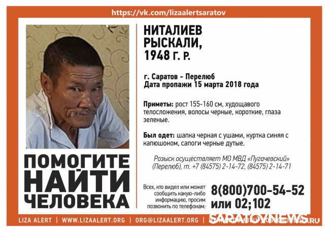 В Саратовской области волонтеры и полиция ведут поиски пропавшего 69-летнего Рыскали Ниталиева. Об этом сообщает поисковый отряд "Лиза Алерт".Сообщается, что мужчина перестал выходить на связь с родными 15 марта.