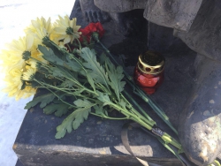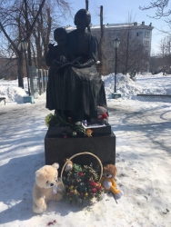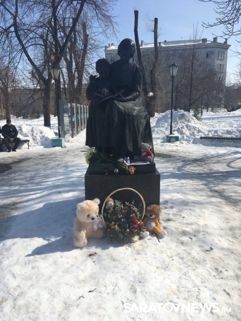 Саратовцы несут цветы, игрушки и свечи к памятнику "Первой учительницы", выражая свои соболезнования в связи с гибелью, по официальным данным, не менее 64 человек. У стихийного мемориала появилась табличка с надписью: "Кемерово, мы с вами!".