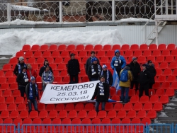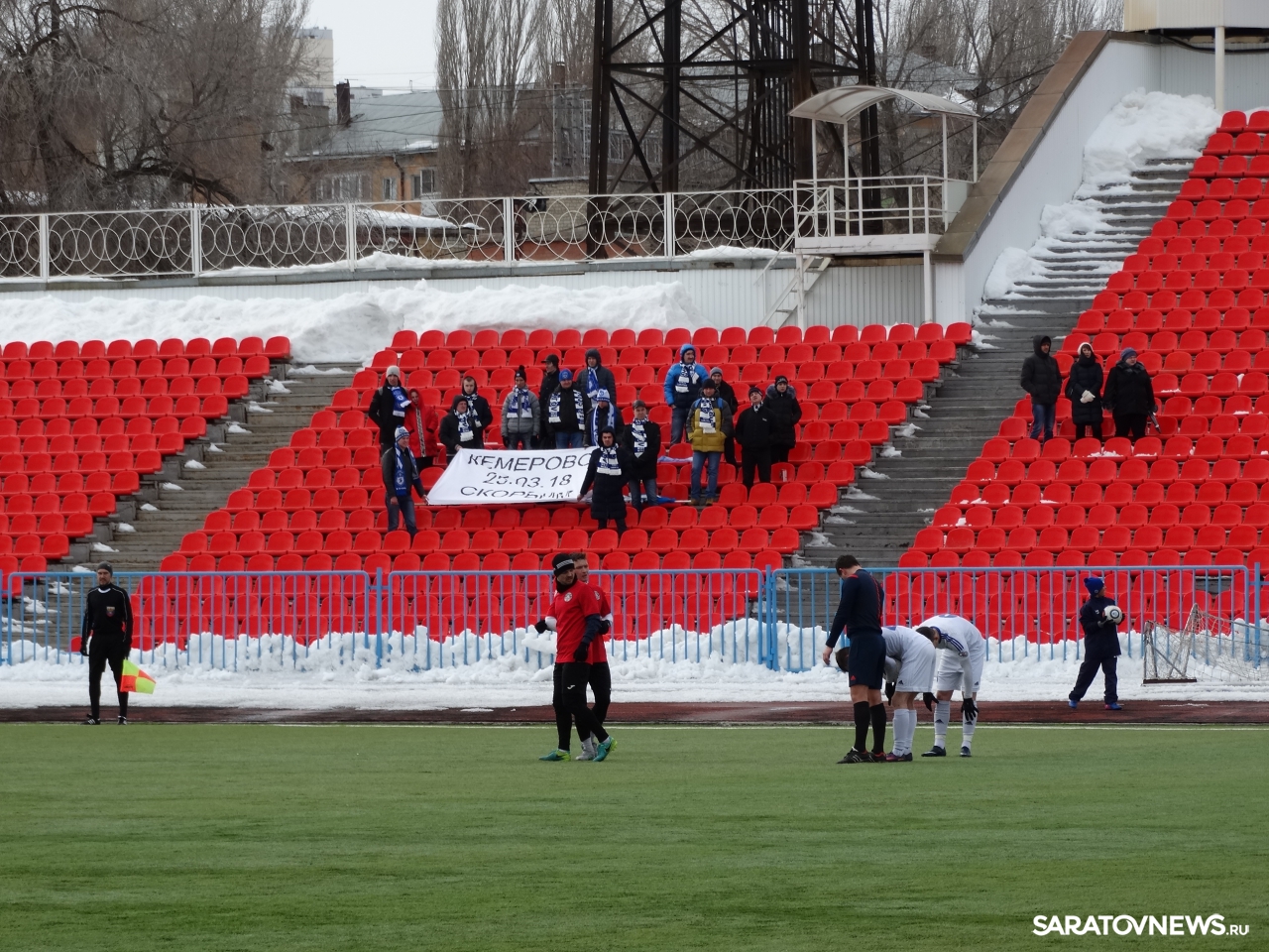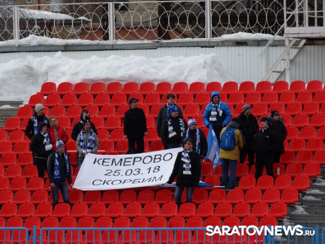 Вчера в Саратове футболисты "Сокола" провели первый домашний матч этого года с командой "Дорожник" из Каменки Пензенской области. Болельщики саратовского клуба решили почтить память погибших в результате крупного пожара в торговом центре в Кемерово, растянув баннер с надписью "Кемерово. 25.03.18. Скорбим".