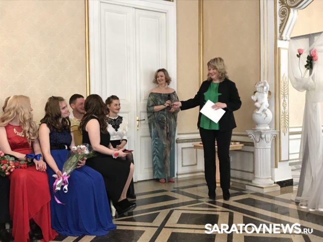 Помимо этого руководитель управления подарила молодоженам "сертификат на бесконечную любовь", назвав его свидетельством о семейном счастье.