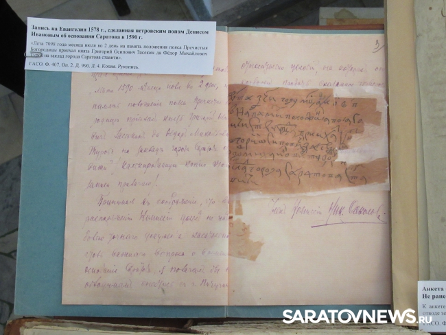 Главный экспонат выставки – копия со страницы Евангелия, на которой рукой попа Дениса Иванова была сделана запись об основании Саратова. Запись гласит: «Лета 7098 году месяца июля во второй день на память положения пояса Пречистые Богородицы приехал князь Григорий Осипович Засекин да Федор Михайлович Туров на заклад города Саратова ставити».