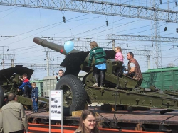Ретро поезд «Воинский эшелон» прибыл сегодня на станцию Сенную Вольского района Саратовской области. РЖД и военно-историческое общество в канун Дня Победы организовали проект, в рамках которого железнодорожный транспорт, груженный танками, зенитками и другой техникой разъезжает по стране.