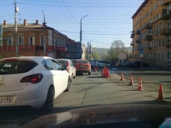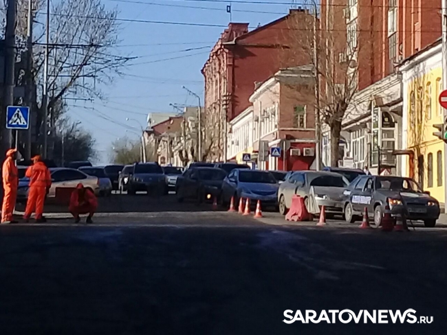 В Саратове перекрыта улица Кутякова на участке от Горького до Радищева. Из-за этого образовалась пробка. Ведутся ремонтные работы, о сроках окончания которых не сообщается.