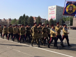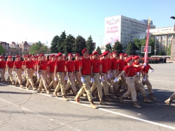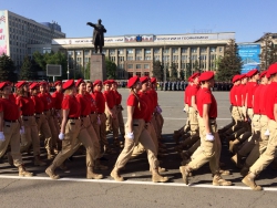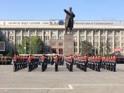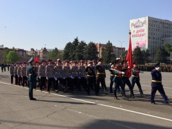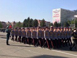 Представители войск Саратовского гарнизона, юнармии, казаки, кадеты, спасатели, росгвардейцы прошли по Театральной площади под звуки сводного военного оркестра. В рамках репетиции состоялось выступление роты почетного караула Вольского военного института материального обеспечения.
