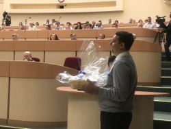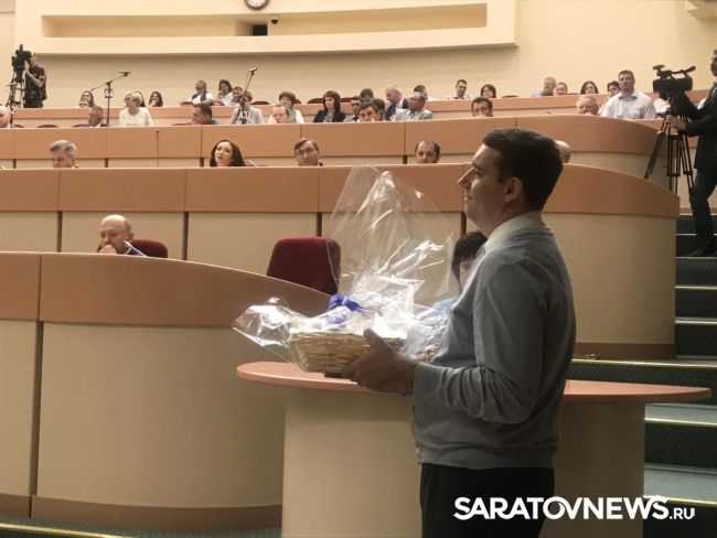 Затем перед присутствующими выступил депутат Александр Анидалов, который принёс на заседание думы потребительскую корзину, показав, что если разделить все продукты на неделю, то их получится очень мало.