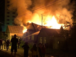 Пожарные стараются тушить огонь между домами, чтобы огонь не распространялся, однако он охватил уже четыре дома. Они не могут объехать постройки с другой стороны, так как там перекопана дорога.