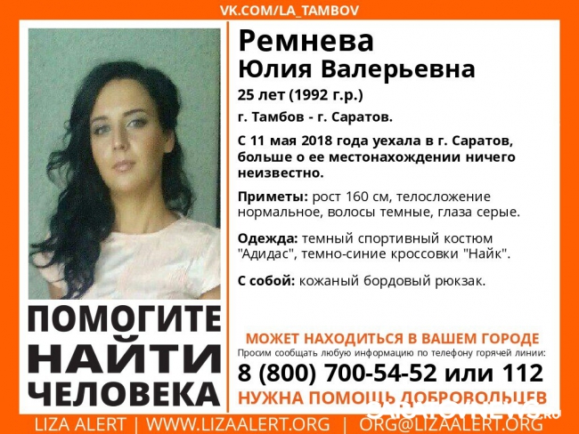 По данным волонтеров, 11 мая девушка уехала из Тамбова в Саратов, после чего перестала выходить на связь с близкими.