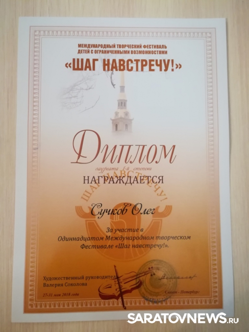 Воспитанник детской школы искусств №4 Энгельсского муниципального района Олег Сучков, благодаря поддержке депутата Энгельсского городского Совета депутатов, директора ООО «Мехуборка-Саратов» Марии Клочковой, посетил одиннадцатый Международный творческий фестиваль-конкурс «Шаг на встречу!» в Санкт-Петербурге и стал его достойным победителем. Фестиваль детей с ограниченными возможностями «Шаг навстречу!» проводился при поддержке Администрации Президента России, Правительства России, Государственной Думы Российской Федерации, Совета Федерации Государственной Думы Российской Федерации, Правительства Санкт-Петербурга.