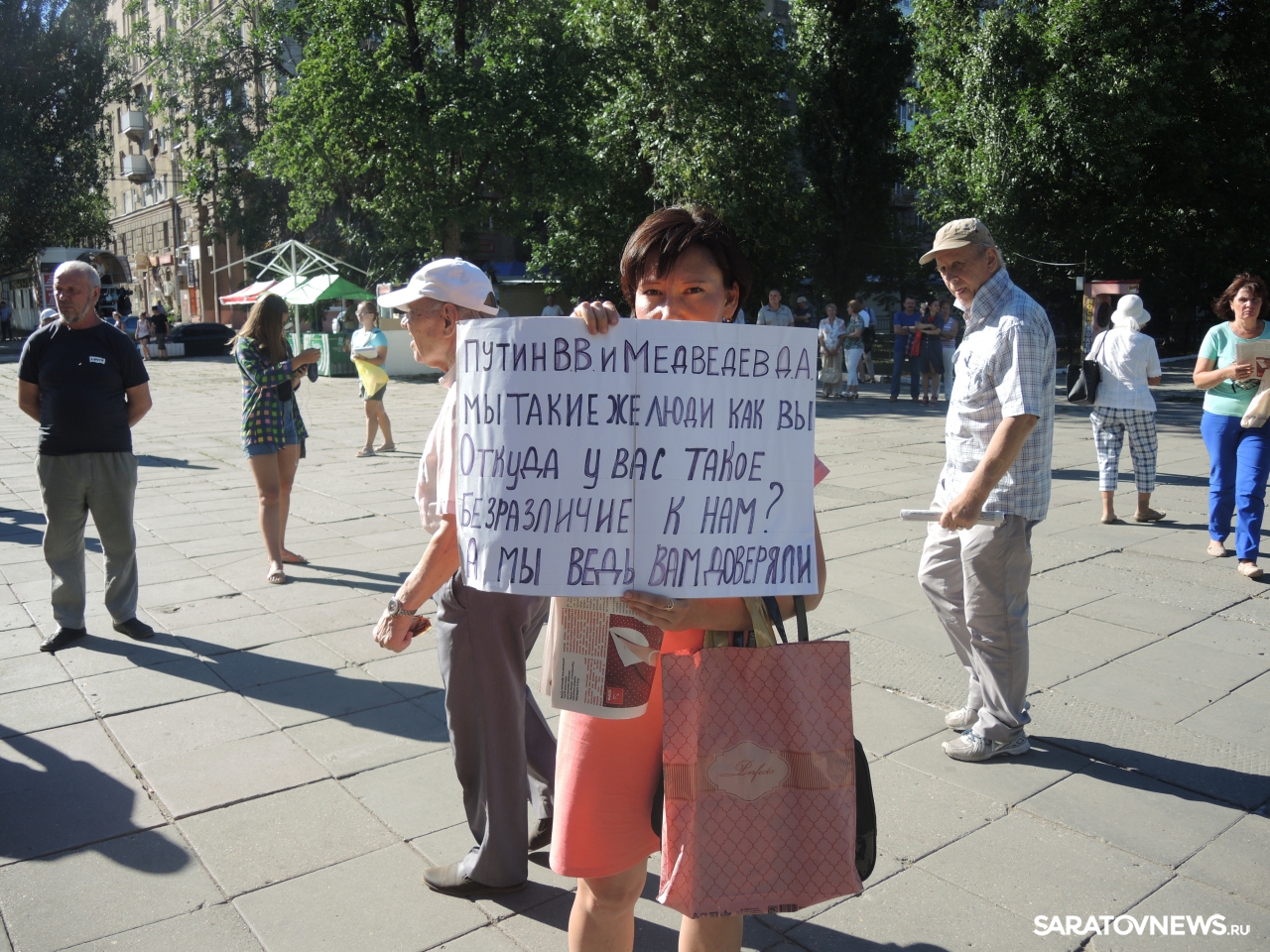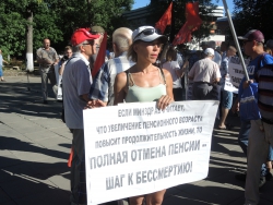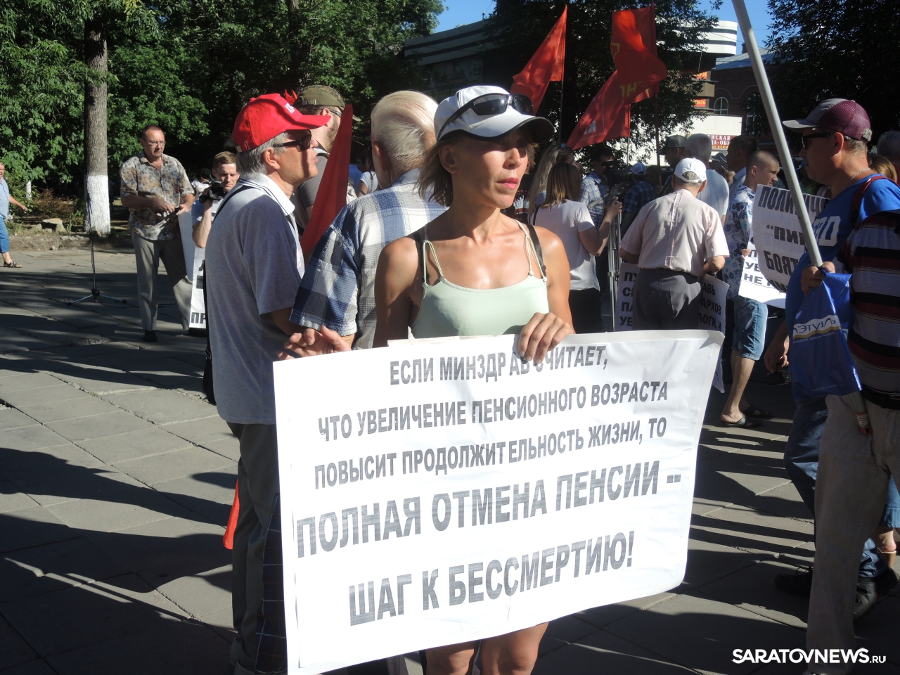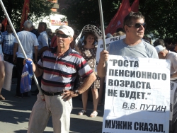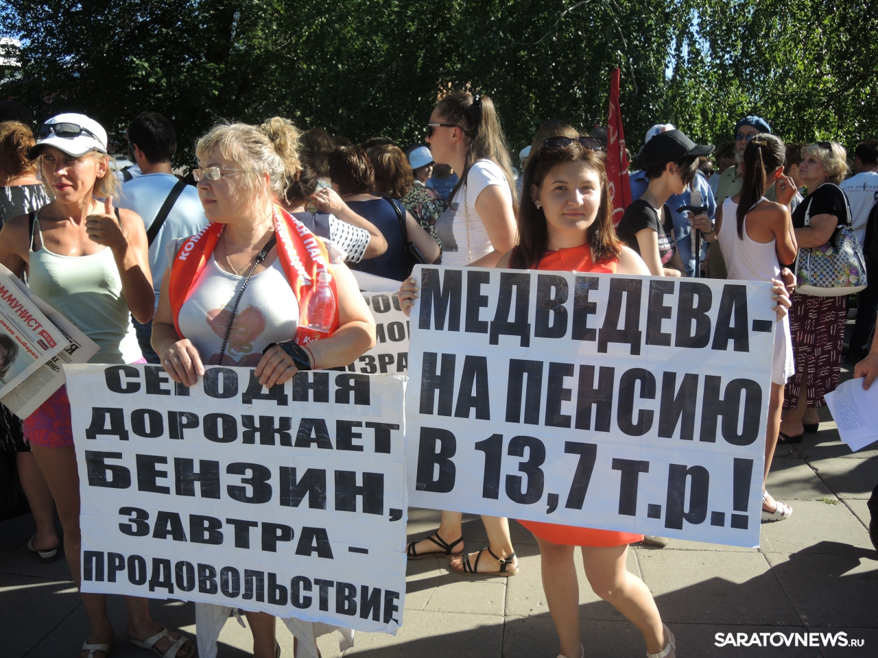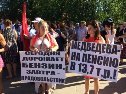 Несколько сотен горожан, в том числе сторонники КПРФ, пришли с плакатами: «За рост бензина и пенсионного возраста – Медведева в отставку!», «Министерство соцзащиты издевается над пенсионерами», «Если минздрав считает, что увеличение пенсионного возраста повысит продолжительность жизни, то полная отмена пенсии – шаг к бессмертию», «Похоже, Россия станет первой страной, в которой пенсионный возраст превысит продолжительность жизни».