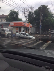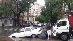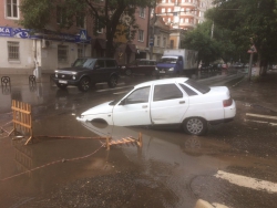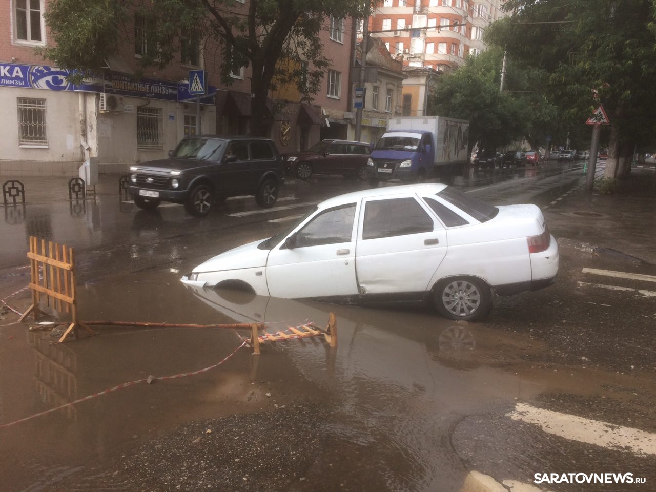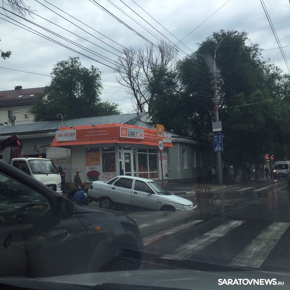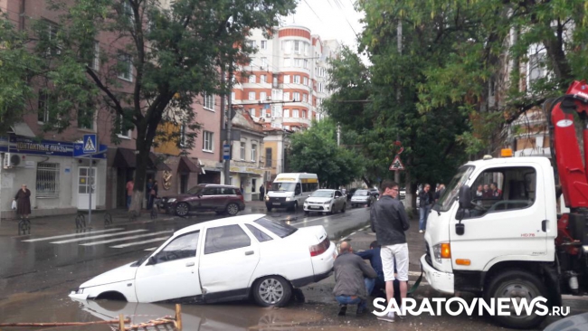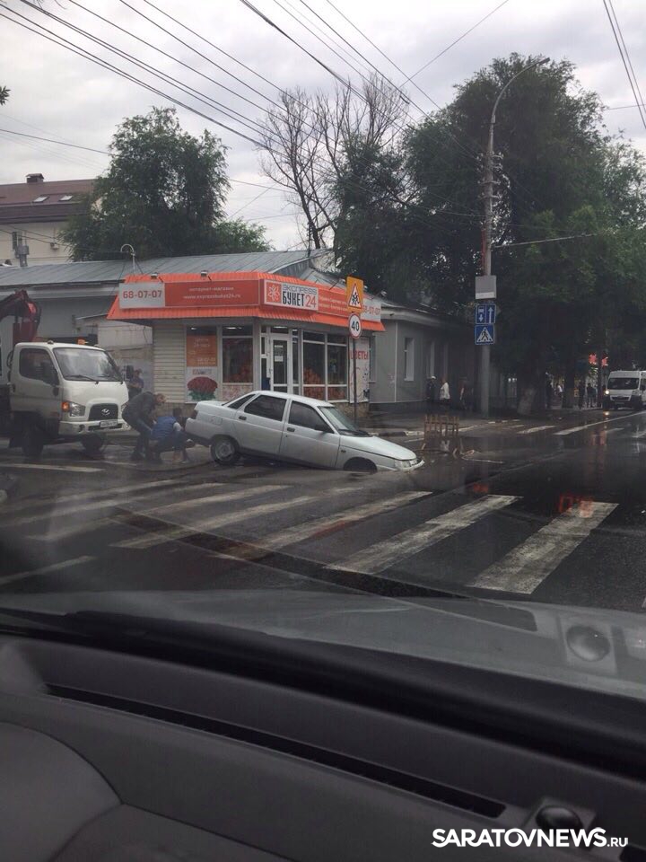 В Волжском районе Саратова автомобиль провалился в яму на проезжей части. ДТП произошло на пересечении улиц Чернышевского и Соляной. Еще вчера дыра в асфальте была огорожена и заметна водителям издали. Ночью прошел обильный дождь, провал наполнился водой и превратился в серьезную угрозу.