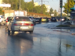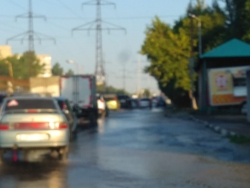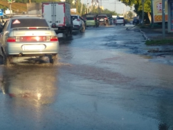 Поток воды, заливвающий проезжую часть, создает проблемы для водителей и пешеходов. Местные жители и сейчас не могут перейти улицу, не замочив ног.