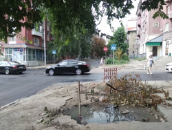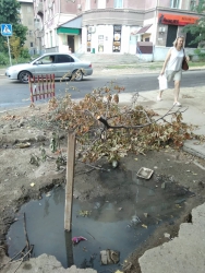 В Волжском районе Саратова образовался провал грунта. На пересечении улиц Провиантской и Рабочей пешеходы вынуждены обходить яму, заполненную водой. Жители района воткнули в грунт палку и бросили ветку, чтобы обозначить опасный участок.