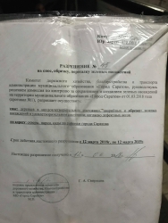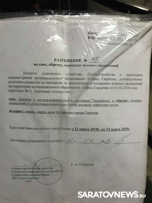 Сотрудники бригады МУП «Саргорсвет», работавшие на участке, пояснили журналисту, что техническое задание предусматривает снос всех деревьев на тротуаре улицы Астраханской в квартале между улицами Московской и Кутякова. В документе, который продемонстрировали сотрудник МУПа, значится, что разрешение дано на «снос деревьев в неудовлетворительном состоянии , аварийных и обрезку зеленых насаждений в удовлетворительном состоянии, согласно дефектных актов». Адрес: «скверы, парки, сады по района Саратова». Срок действия разрешения №45 за подписью председателя дорожного комитета администрации города Свиридова – год, с 12 марта 2018 г. по 12 марта 2019 г.