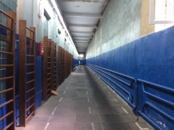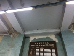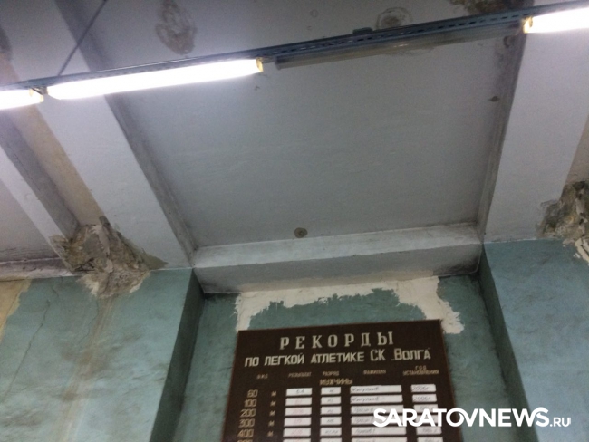 Далее спикера провели в закрытый манеж, расположенный под трибунами, с обшарпанными стенами и подтёкшими потолками.
