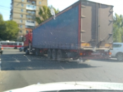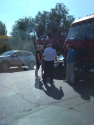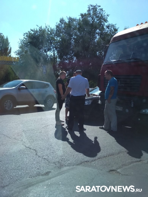 В Ленинском районе Саратова произошло ДТП. На кольцо проспекта Строителей столкнулись фура Schmitz и иномарка. Судя по номерным знакам, большегруз зарегистрирован в Волгоградской области.