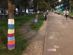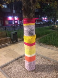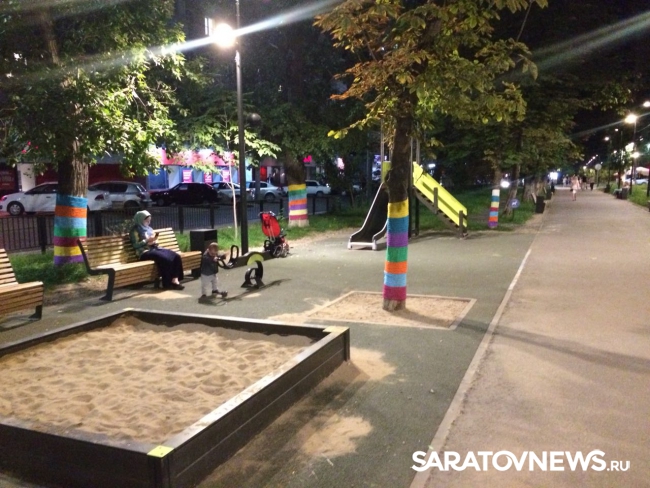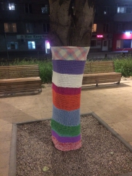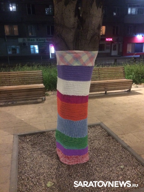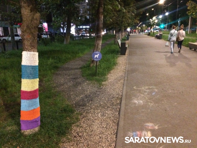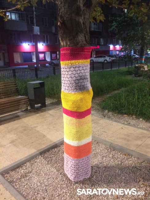 «На стволах деревьев появились яркие вязаные «чехольчики», похожие на носки. Выглядит это все довольно мило, особенно понравилось детям, которые с удовольствием трогают новую «одежду» деревьев», – сообщила одна из местных жительниц.