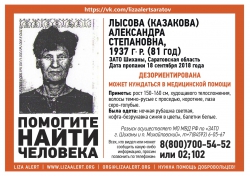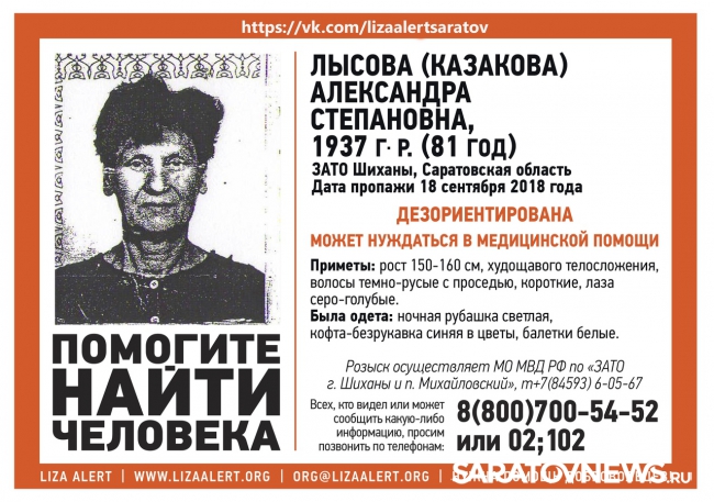 В Саратовской области волонтеры и полиция ведут поиски пропавшей 81-летней Александры Лысовой из Шихан. Информация об этом появилась в группе "Лиза Алерт" в социальной сети "ВКонтакте".