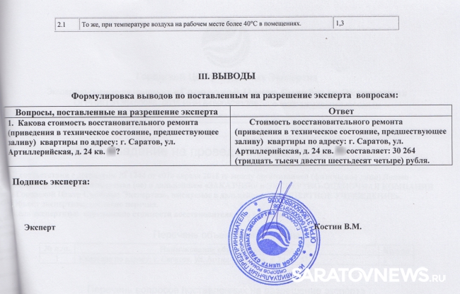 Между тем, собственница пострадавшей от наводнения квартиры Валентина Лопато обратилась к судебному эксперту, чтобы установить стоимость нанесенного ущерба. Затраты на ремонтно-восстановительные работы были определены в сумме более 30 тысяч рублей. Кроме того, сама строительно-техническая экспертиза обошлась женщине в пять тысяч рублей. В отчете независимого эксперта указана причина ЧП – «последствия залива из-за нарушения целостности кровельного покрытия».