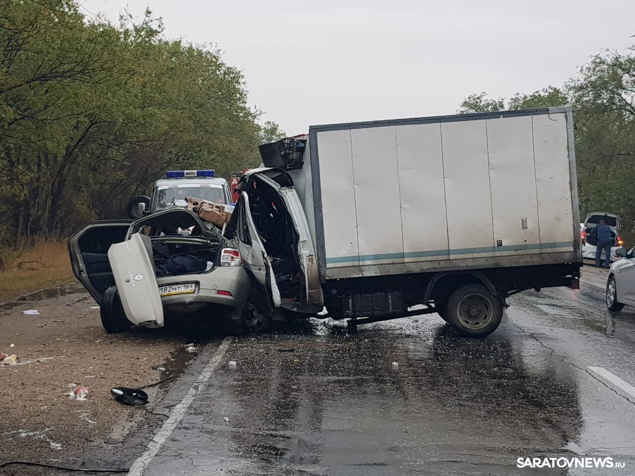 «В 08.59 на 2-м километре автоподъезда к Балаково вблизи села Быков Отрог водитель «Рено Логан» в пути следования (направлялся со стороны Балаково в сторону Саратова), не справился с управлением и допустил столкновение с грузовой ГАЗелью (термо-будка, не пассажирская).