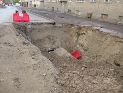 Причиной затора послужили ремонтные работы, которые выполняются на перекрестке Мичурина и Соборной. Экскаватор и двое рабочих укладывают бетонные плиты после замены труб. Техника полностью перекрыла проезжую часть.