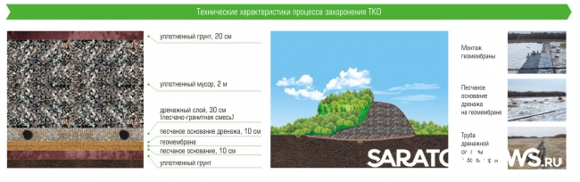 «Построенные нашей компанией полигоны захоронения коммунальных отходов являются сложным инженерно-техническим сооружением. Полигон гарантирует защиту грунтовых вод и почвы от проникновения токсинов, которые выделяются в процессе естественного перегнивания складированных отходов. Высокая степень экологической защиты окружающей среды достигается строительством котлована с укладкой нескольких слоев специализированного основания и геомембранной защиты. Защита атмосферного воздуха достигается специальной технологией складирования отходов, с уплотнением и пересыпками грунтовыми слоями. Соблюдение технологий складирования и качество предварительной обработки ТКО позволяют обеспечить отсутствие возгораний мусора на Энгельсском и Балаковском межмуниципальных полигонах ТКО, где с начала эксплуатации карт не зафиксировано ни одного такого случая» - отмечает главный инженер саратовского филиала компании АО «Управление отходами» Станислав Ковальский.