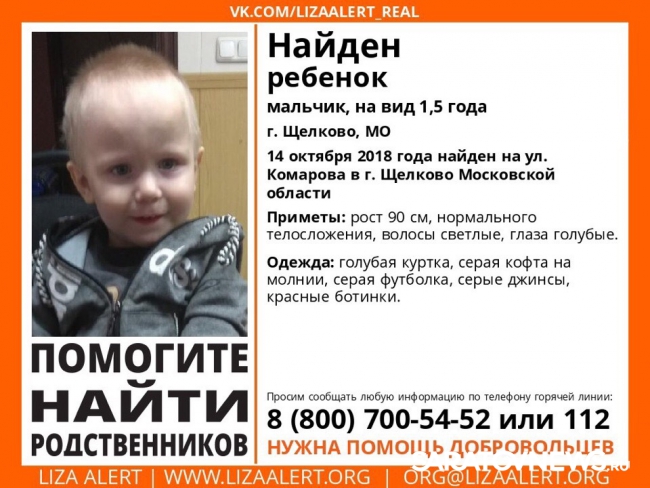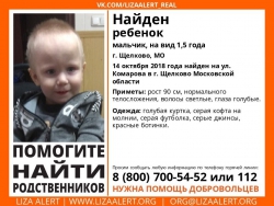Волонтеры поискового отряда «Лиза Алерт» разыскивают родственников найденного в подъезде дома в Щелково Московской области 1,5 годовалого мальчика.