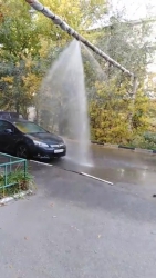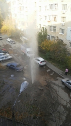 Сообщается также, что в рядом по этой же улице у дома №25 из водопровода бьет другой фонтан. Причем, вода там горячая.