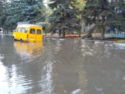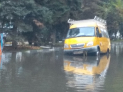 По версии местных жителей, ливневки не справились с выпавшими вчера осадками и в результате образовалась огромная яма. По их заверениям, в этом месте провалилось дорожное полотно, о чем водитель, естественно, не знал и утопил машину в яме с водой. "Газель" попала в ловушку одним колесом. Водителя на месте нет. По всей видимости, он пошел за подмогой.