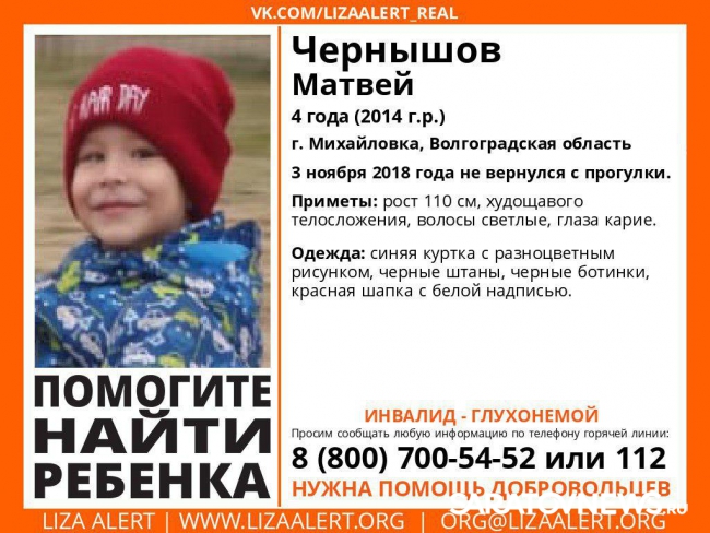 Поисковики обнародовали приметы ребенка. Рост Матвея - метр 10 сантиметров, он худощавый, кареглазый, светловолосый. Мальчик был одет в красную шапку с надписью, синюю куртку с разноцветными рисунками, черные штаны и черные сапоги. Ребенок не говорит и не слышит.