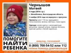 Волонтеры поискового отряда "Лиза Алерт Саратов" выехали на поиски четырехлетнего Матвея Чернышова в Михайловку Волгоградской области. Мальчик пропал вчера, 3 ноября, во время прогулки, говорится на странице отряда во ВКонтакте.