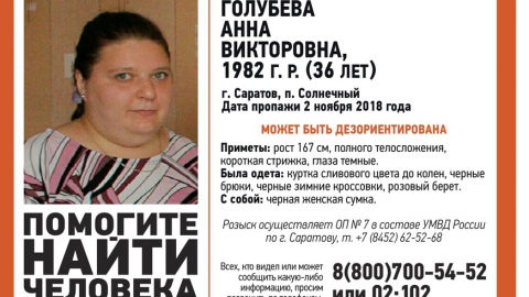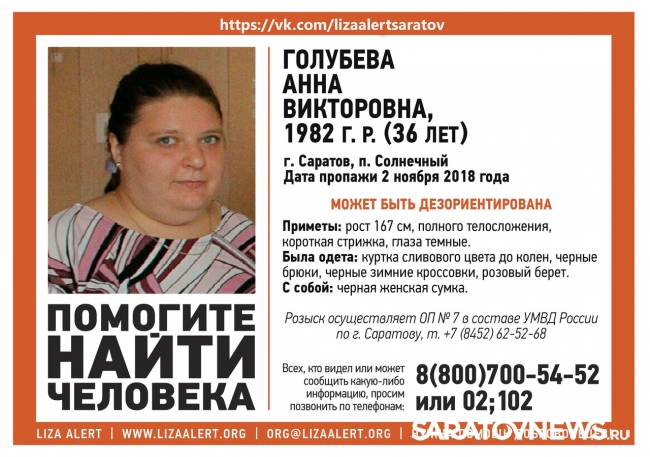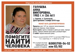 Добровольцы поискового отряда «Лиза Алерт Саратов» разыскивают 36-летнюю Анну Голубеву. Женщина пропала 2 ноября в поселке Солнечный областного центра. Ее рост - 167 сантиметров, полная, глаза темные, короткая стрижка.