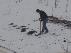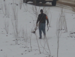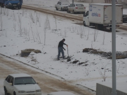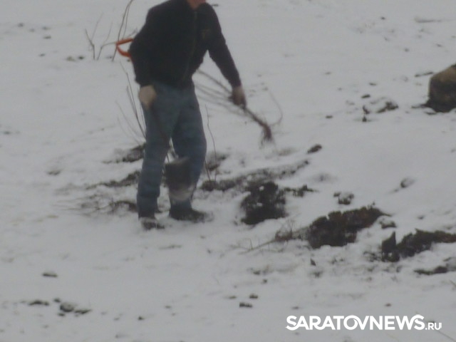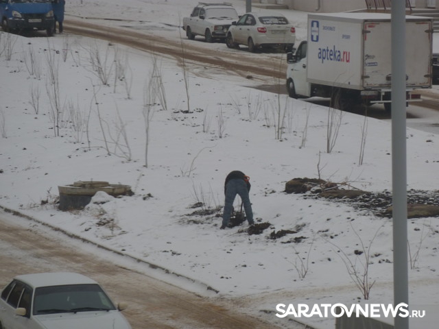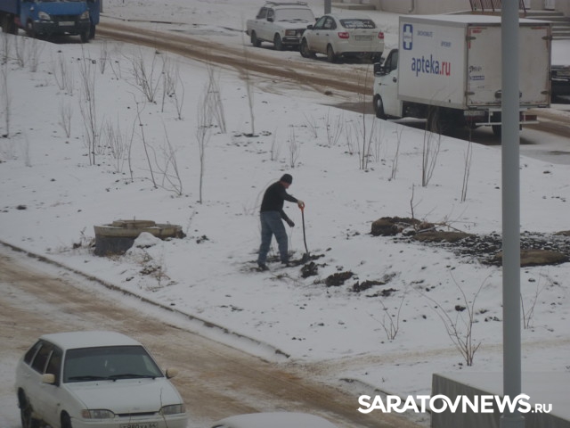 Пользователи социальных сетей обсуждают коммунального работника, который сажал деревья после прошедшего в Саратове вчера снегопада.