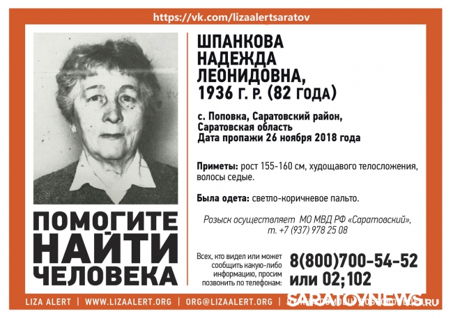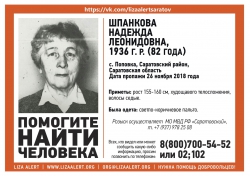 В Саратовской области уже неделю ищут 82-летнюю Надежду Шпанкову из села Поповка, сообщается на странице поискового отряда "Лиза Алерт - Саратов".